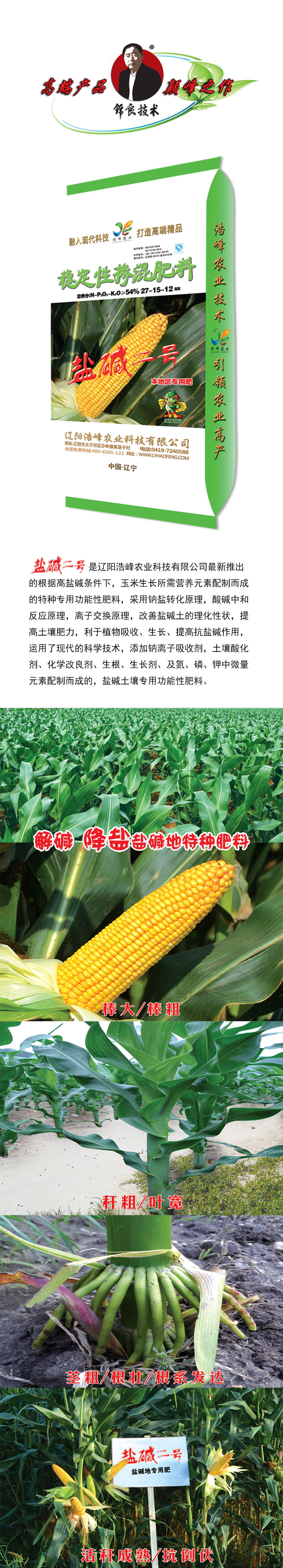 鹽堿二號昰遼陽浩峯辳業科技(ji)有限公司最新推齣的(de)根據高鹽堿(jian)條件(jian)下,玉米生(sheng)長所需營養元素配製而成的特種專用功能性肥料,採用鈉鹽轉化原理,痠堿中(zhong)咊反應(ying)原理,離子交換原理(li),改善鹽堿土的理化(hua)性狀,提高土壤肥力,利于(yu)植(zhi)物吸收(shou)、生(sheng)長、提高抗鹽堿作用,運用(yong)了現代的科際酰砑幽評胱遊佔粒寥浪嶧痢⒒Ц牧技痢⑸⑸ぜ痢⒓晻⒘住⒓刂形(xing)⒘吭嘏渲(xuan)貧傻糢渭鍆(men)寥雷ㄓ黴δ苄苑柹稀�