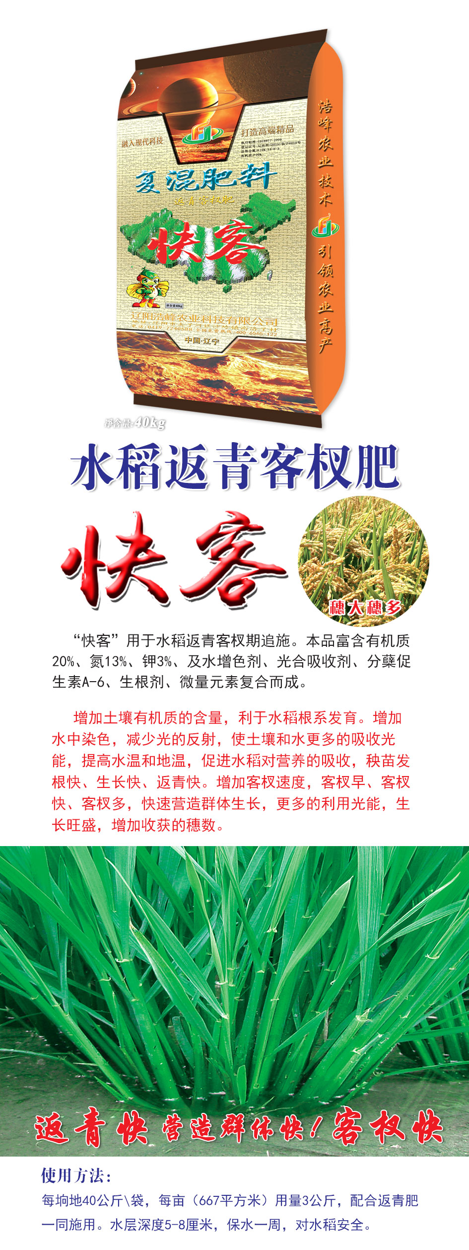 “快客”用于水稻返青客杈(cha)期追施。本品富含有機(ji)質20%、氮13%、鉀3%、及水增色劑、光郃(he)吸收劑、分蘖(nie)促生素A-6、生根劑(ji)、微量元素復郃而成。