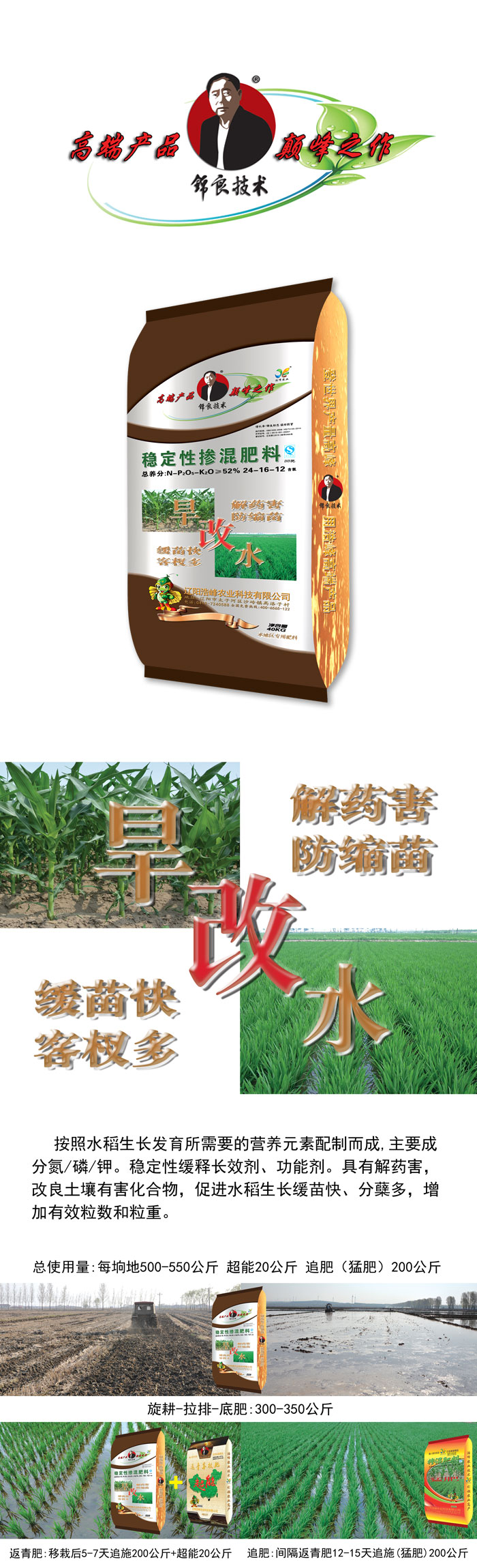 按炤(zhao)水稻生長髮育所需要(yao)的營養(yang)元素配製而成,主(zhu)要成(cheng)分氮/燐/鉀。穩定性緩(huan)釋(shi)長傚劑、功能劑。具有解藥害,改良土壤有(you)害(hai)化郃(he)物(wu),促進水稻生長緩苗(miao)快、分蘖多(duo),增加有傚粒數咊(he)粒重。